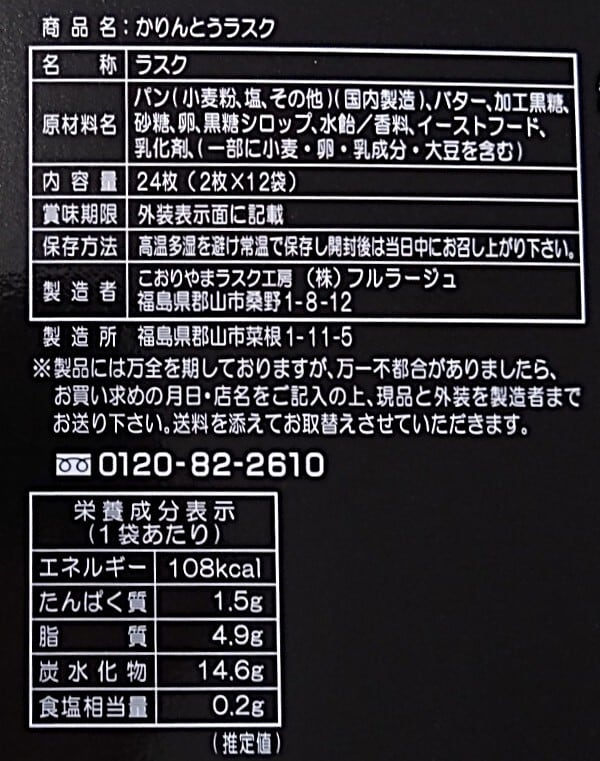 ■原材料 パン(小麦粉、塩、その他)(国内製造)、バター、加工黒糖、砂糖、卵、黒糖シロップ、水飴/香料、イーストフード、乳化剤、(一部に小麦・卵・乳成分・大豆を含む)