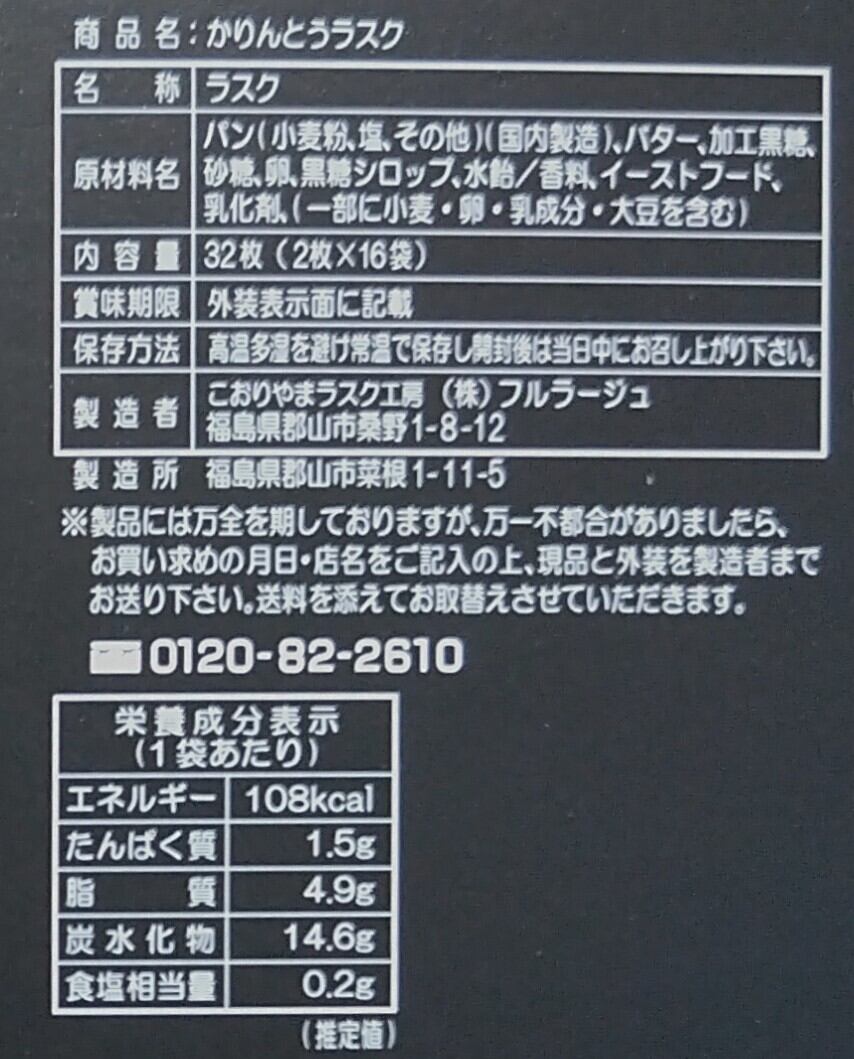 ■原材料 パン(小麦粉、塩、その他)(国内製造)、バター、加工黒糖、砂糖、卵、黒糖シロップ、水飴/香料、イーストフード、乳化剤、(一部に小麦・卵・乳成分・大豆を含む)