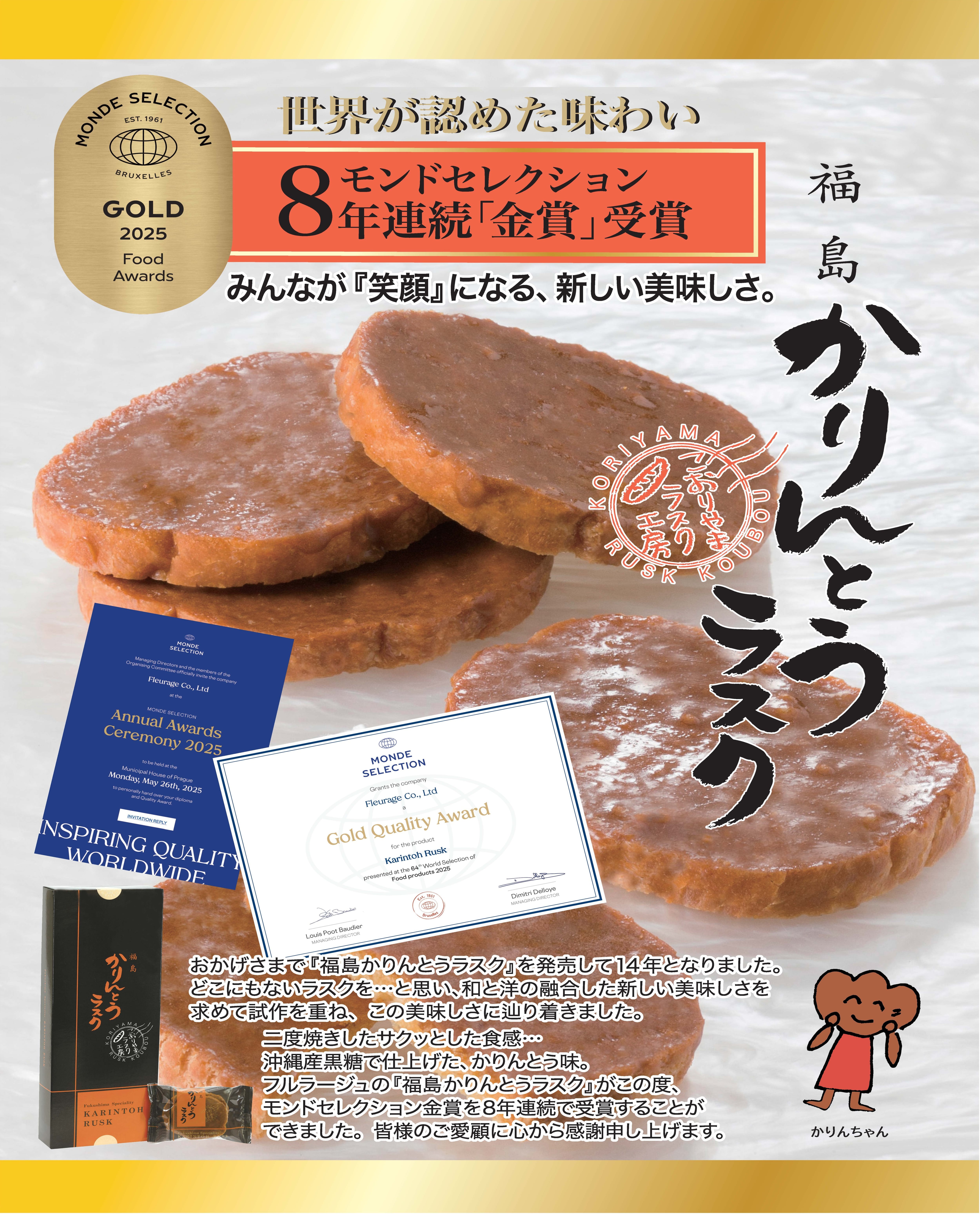 美味しいラスクのために焼き上げたフランスパンを二度焼きしたサクッとした食感…沖縄産黒糖で仕上げた、ちょっと懐かしいかりんとう風味。