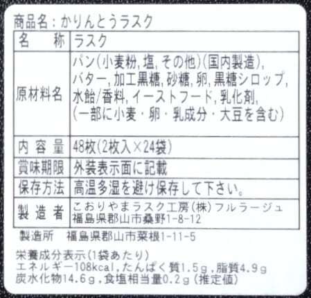 ■原材料 パン(小麦粉、塩、その他)(国内製造)、バター、加工黒糖、砂糖、卵、黒糖シロップ、水飴/香料、イーストフード、乳化剤、(一部に小麦・卵・乳成分・大豆を含む)